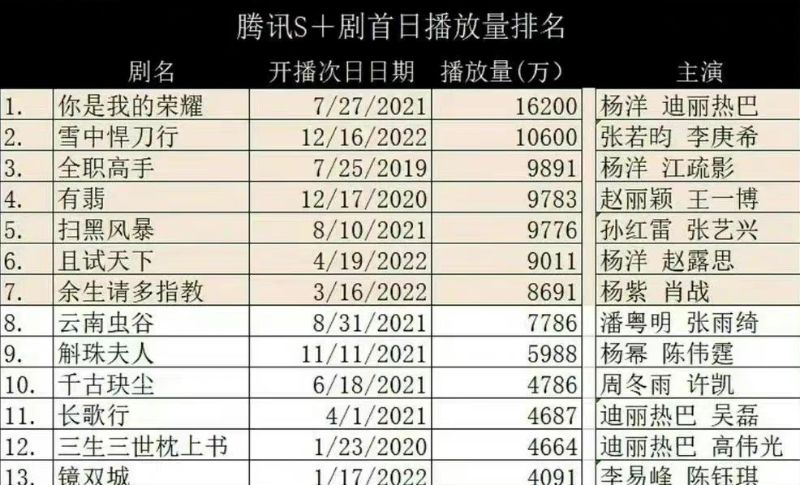 是噠!提到騰訊視頻的S+大劇,可以說每次定檔熱度都比一般劇來得高,因為主演們本身自帶熱度和話題。所以在憑劇情吸引路人粉之前,首播日基本上都靠主演們本身的人氣來招觀眾!這就來看看,鵝爹從2019年至2022年播出的S+大劇裡,究竟首日播放量排行榜情況如何呢???