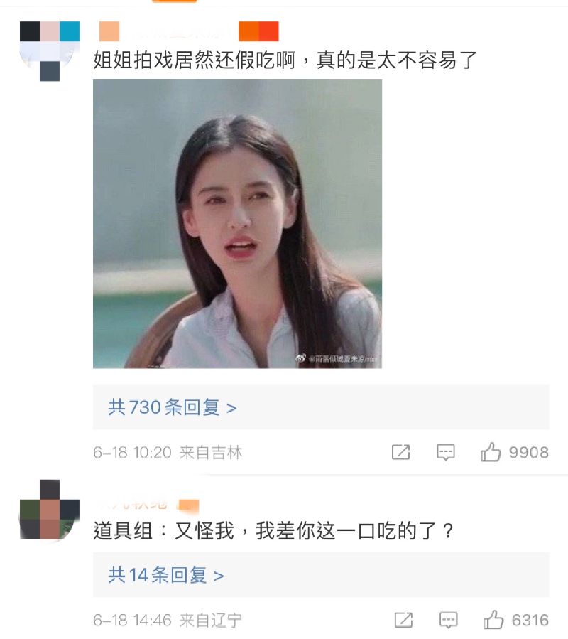 沒錯,有關拍戲假吃這回事,就要科普一下2015年播出的《雲中歌》,當時Baby就被網友發現借位吃肉👇