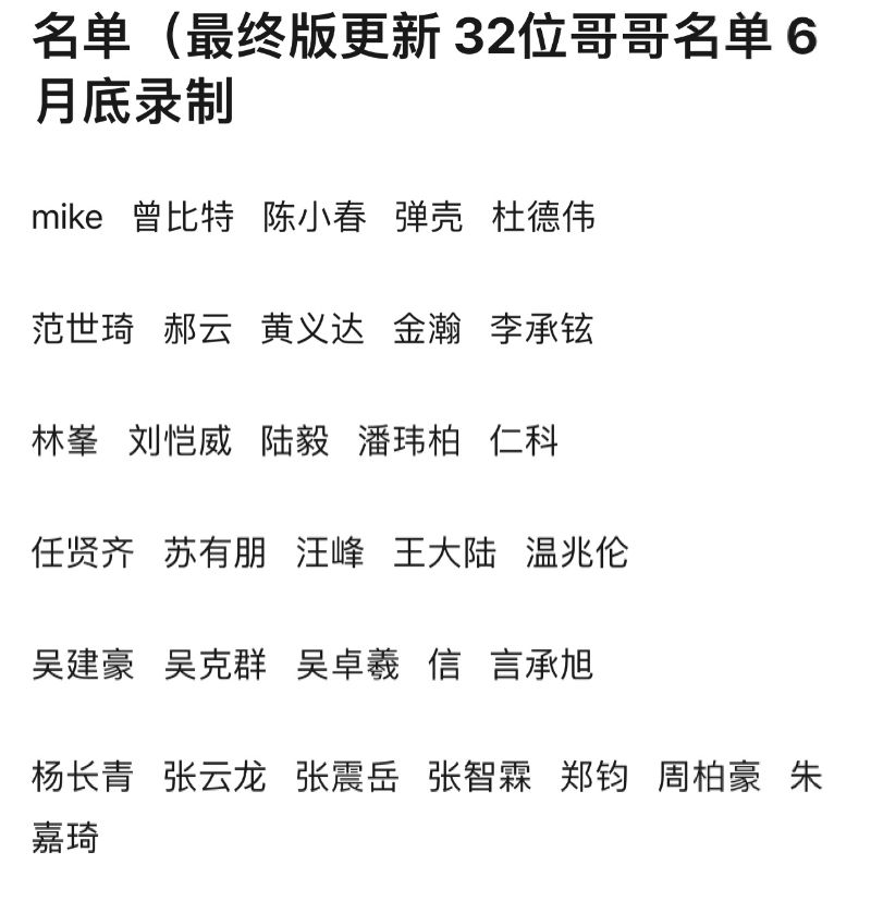 而網傳的32位哥哥們名單也完整曝光,先來看看,之前已經說過第一季會有哥哥回歸,分別就是陳小春👇