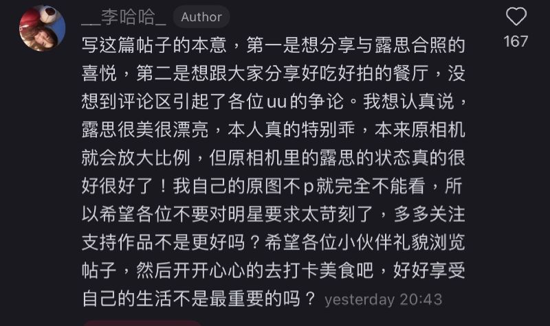 由於評論區帶有惡意的留言太多,於是原po特別解釋,表示趙露思本人很美很漂亮,本人真的特別乖,解釋原相機的狀態真的很好!