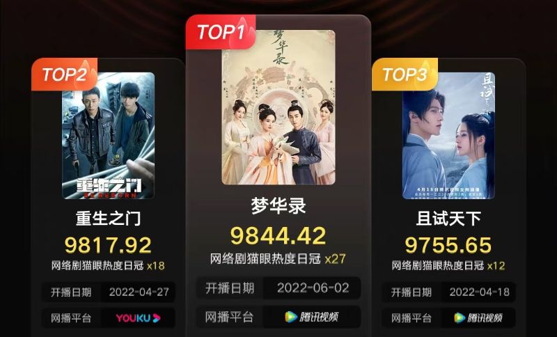 是噠,第一名就是6月初才開播,就稱得上是屠榜的爆劇《夢華錄》,雖然不少網友評價後半部分人設崩塌,但真的是一天好幾個熱搜沒錯,會奪下榜一真的是實際名歸啊!而第二名則是王俊凱、張譯主演的懸疑劇《重生之門》,緊湊又不斷反轉的劇情,真的是很燒腦啊!第三名則是黑熱搜真的很多,但劇也真的很出圈的《且試天下》!而迪麗熱巴和任嘉倫的《恰似故人歸》熱度居然僅排名第五,甚至比不過小成本的《開端》,真的讓人覺得驚訝!
