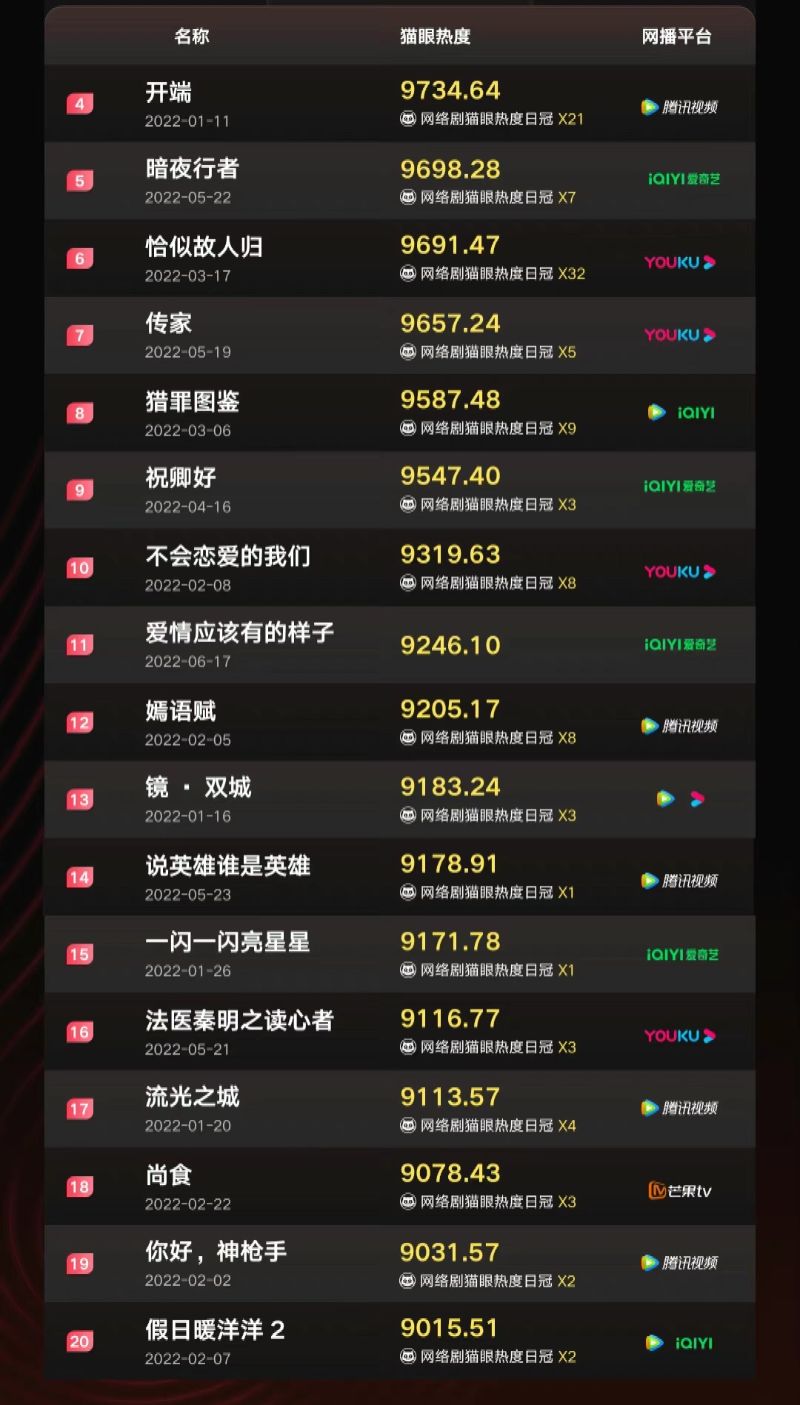 沒錯,最愛看數據帖啦!隨著踏入7月份,不少上半年的榜單紛紛出爐,這就來看看權威性的貓眼,公開的「2022年上半年熱度值最高」網劇和電視劇前20排行榜,到底是哪些劇展開了霸榜狀態呢?