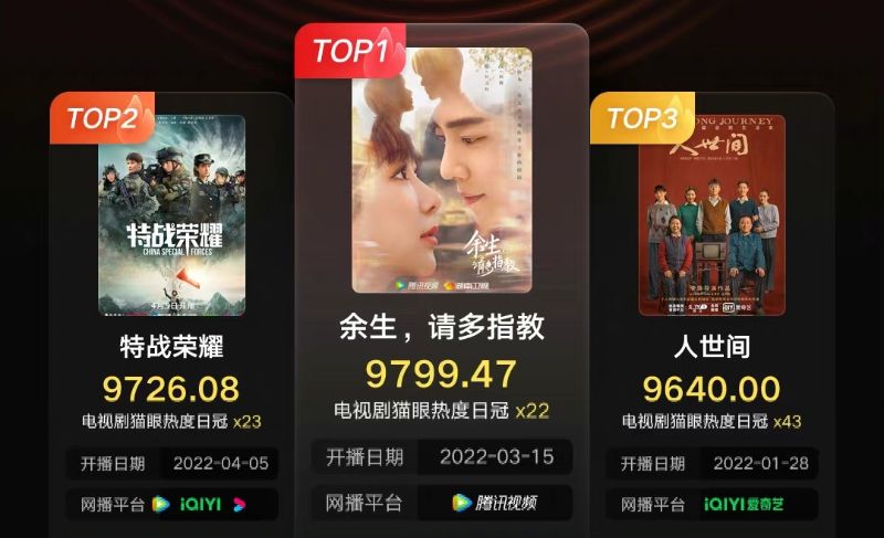 是噠!第一名就是肖戰、楊紫《余生,請多指教》!這部劇從2019年殺青,隔了2年半才定檔,當中還經過延檔波折,讓不少粉絲盼了又盼,終於定檔熱度值自然不會低,加上甜蜜的劇情圈了不少路人粉,熱度妥妥擺在那裡啊!第二名則是同樣2019年就殺青的《特戰榮耀》,楊洋為了這部劇可說豁出去,幾乎全素顏上陣,關注度極高!最後排名第三的是《人世間》,橫跨三代人的故事,經典的電視台圈粉劇啊!