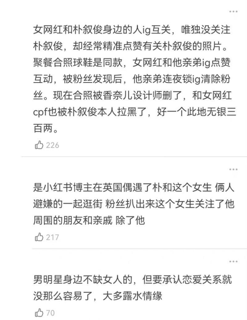 隨著身份疑似被扒,網友陸續扒出這位網紅和朴敘俊身邊的人INS都有互關,唯獨沒有關注朴敘俊,但卻經常點讚有關朴敘俊的照片。被粉絲扒出身份之後,朴敘俊弟弟連夜封鎖INS清除粉絲。除了合照被扒是情侶款球鞋,最懸的是現在合照也被該設計師刪除了,但在這位設計師的INS裡,和其他韓星:比如JENNIE、GD等的合照卻依然保留👇