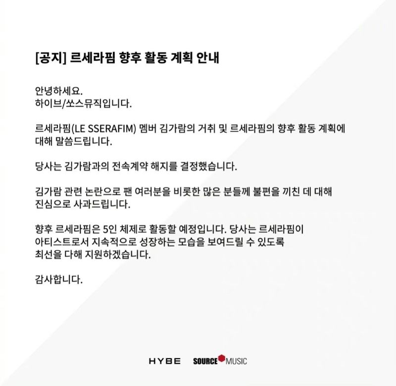 今後LE SSERAFIM將以5人體制進行活動。 本公司將盡最大努力支持LE SSERAFIM作為藝術家持續成長的樣子。」