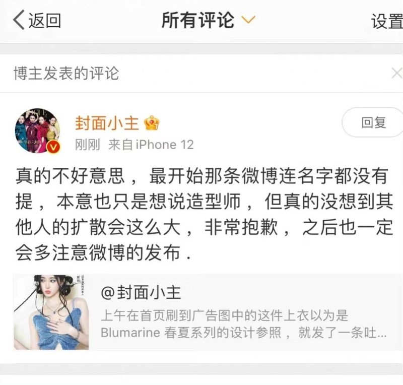 該博主隨後發文道歉,表示自己沒留意到是裙子,才誤以為穿了仿品。