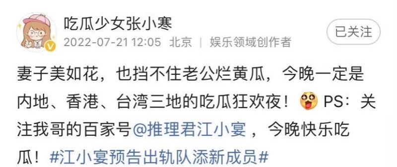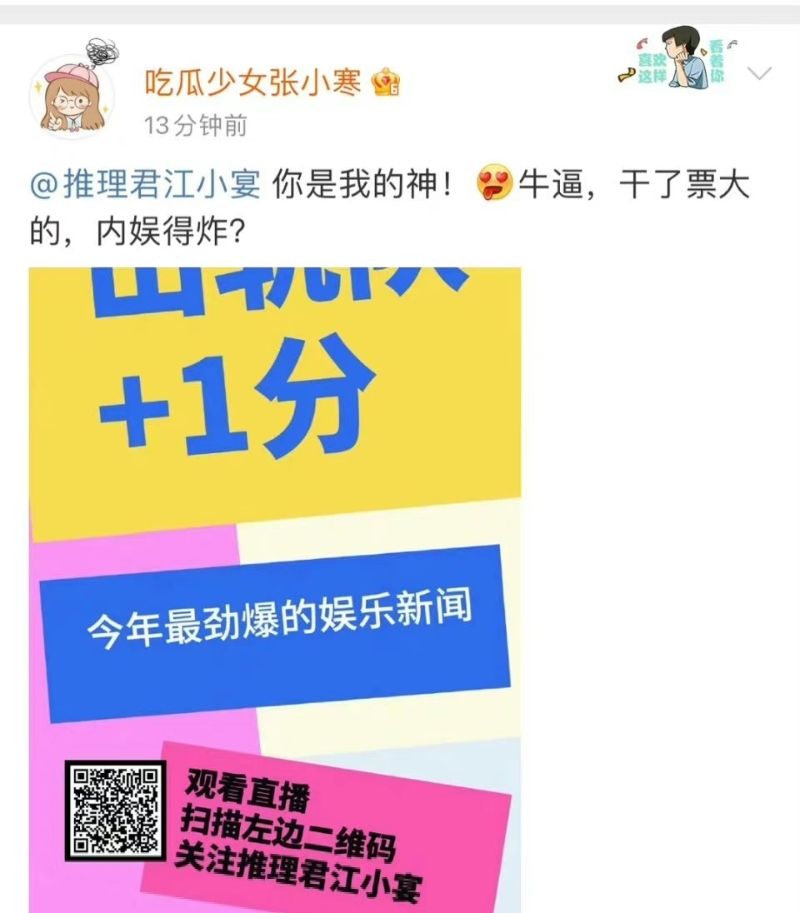 隨後,另一名同樣很出圈的狗仔「張小寒」也發預告,表示江小宴拍到的是大瓜,還說“內娛得炸”?