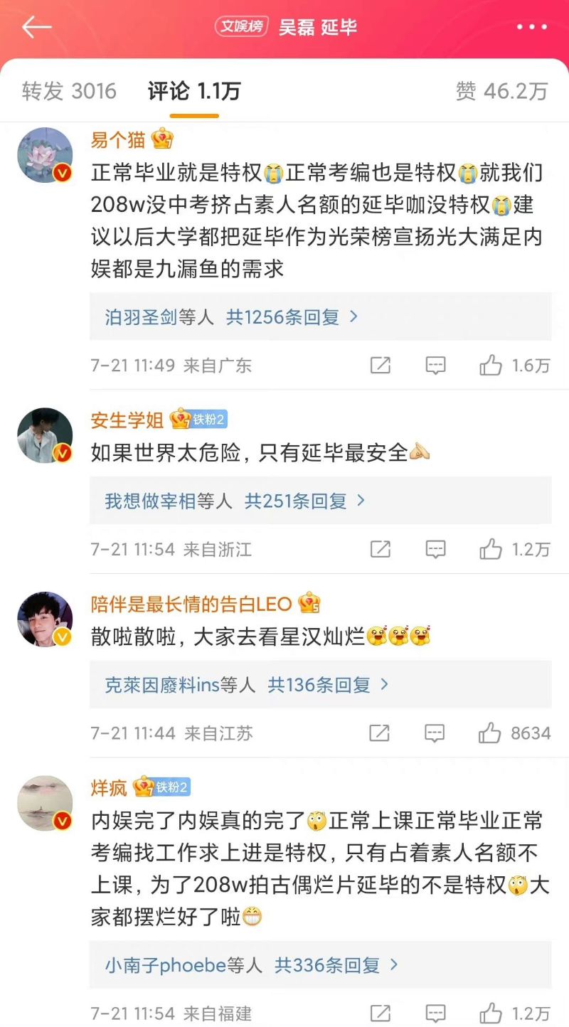 但也有另一批網友認為不公平,為什麼吳磊延畢就是沒特權,而正常畢業的則被稱有特權?這雙標是怎麼回事?