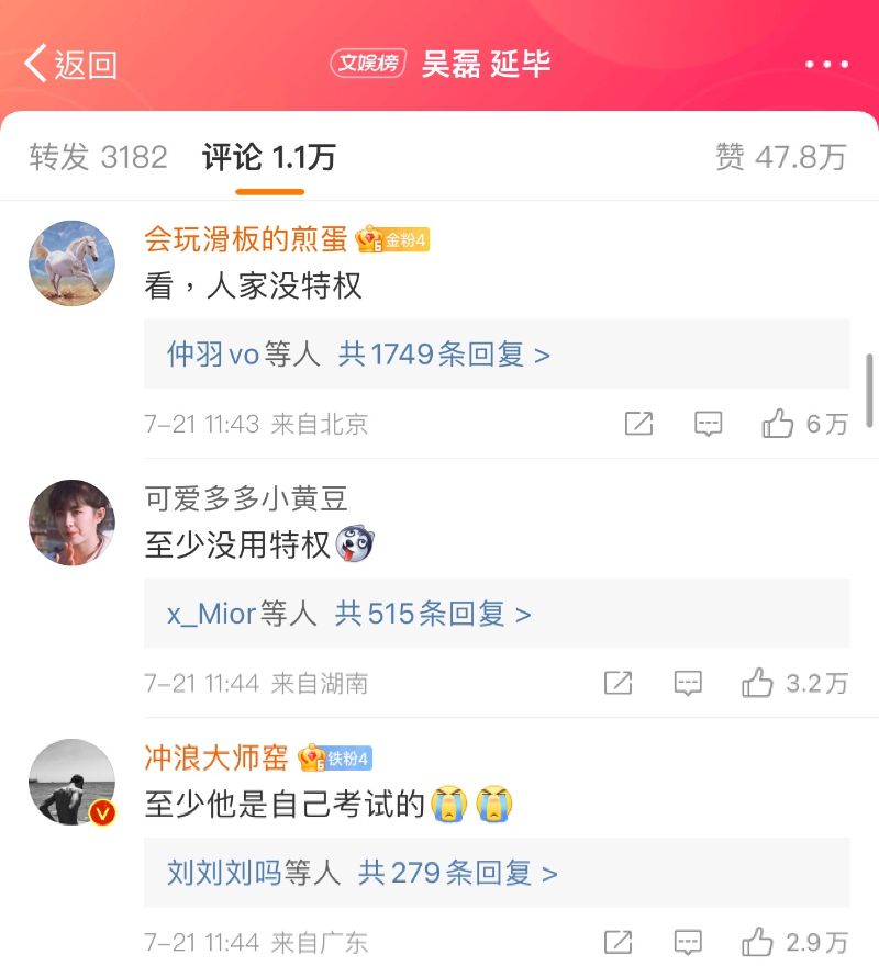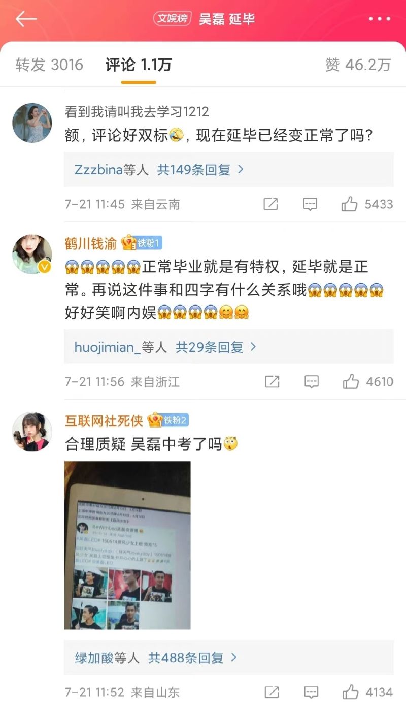 隨著,就有網友爆料表示吳磊延畢,所以並沒有出現在答辯、也沒拍畢業照。吳磊延畢消息傳出之後,網友評價可以說很極端,熱評都在表示延畢沒什麼,至少他沒特權~是噠,由於之前易烊千璽考國家話劇院爭議,不少網友對於藝人上學這部分特別敏感,而吳磊延畢,也證實了藝人沒有特權👇