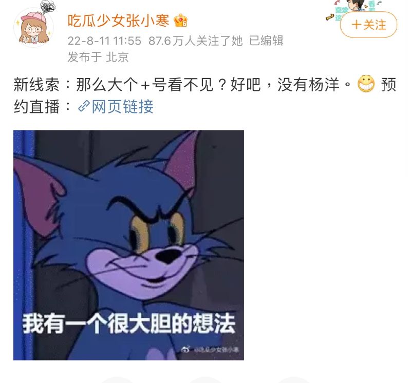引起高度議論之後,張小寒在11號早上再縮小線索範圍,表示拍到的是粉絲破5000萬的「楊姓」頂流瓜!
