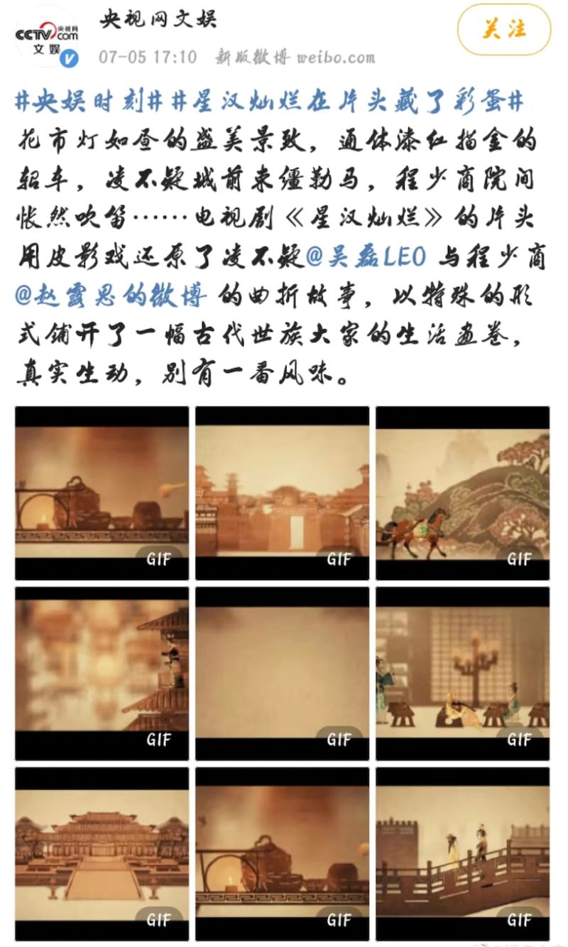 但如果說,一般劇迷每次會選擇「自動跳過」的片頭曲都暗藏細節,你會不會再一次被費寶的“精緻”震撼到了呢?是噠,《星漢燦爛》開播初期,就有不少人對片頭曲居然採用皮影戲表示震驚,一整個質感大Up!就連央視網都點名稱讚,表示片頭皮影戲弘揚民族傳統文化,配樂古風大氣婉約,別出心裁!不過你發現了嗎?央視網已經提到,皮影戲對應劇情,但開播初期,真的鮮少人能發現這點!