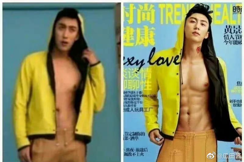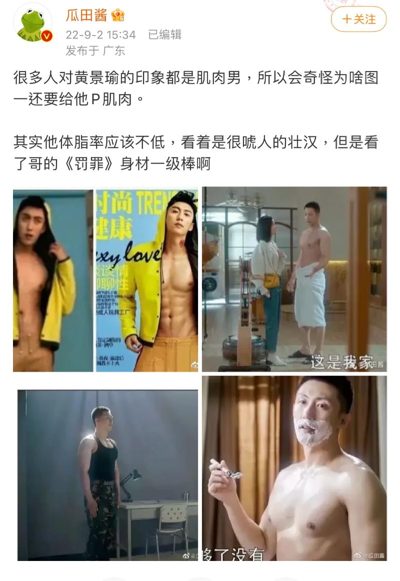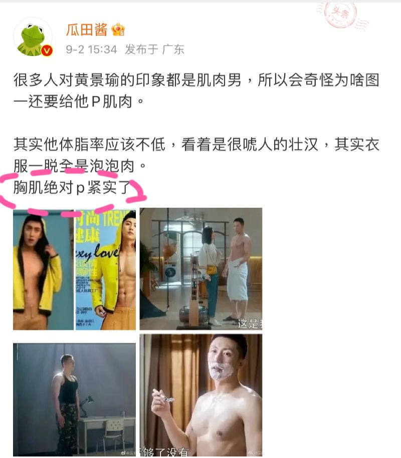 有營銷號發了黃景瑜的肌肉照,表示不少人好奇為啥黃景瑜拍雜誌時需要P肌肉,評價黃景瑜雖然看起來是壯漢,其實衣服一脫全是泡泡肉,結論:「胸肌絕對p緊實了」。