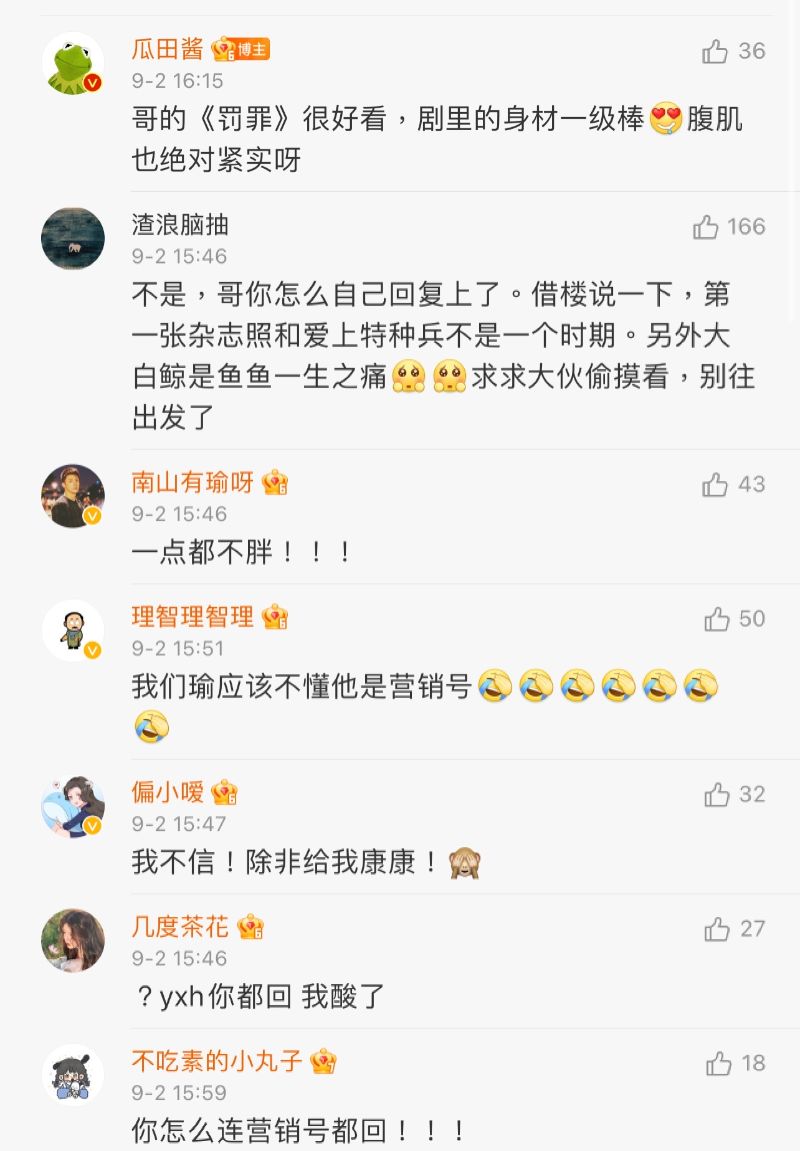 結果沒想到這麼一篇黑帖,居然還招來了本尊親自留言,自黑表示:「那會兒確實胖我認,我最近又胖成這樣了!」嚇得營銷號小編馬上留言:「哥的《罰罪》很好看,劇裡的身材一級棒!腹肌也絕對緊實呀!」哈哈哈哈哈哈哈哈哈哈哈哈哈哈哈哈哈哈哈哈哈哈哈!