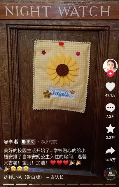 根據李湘,校方特別安排了王詩齡入住英國安妮公主曾住過的宿舍,在照片中可看見十分古典雅緻!