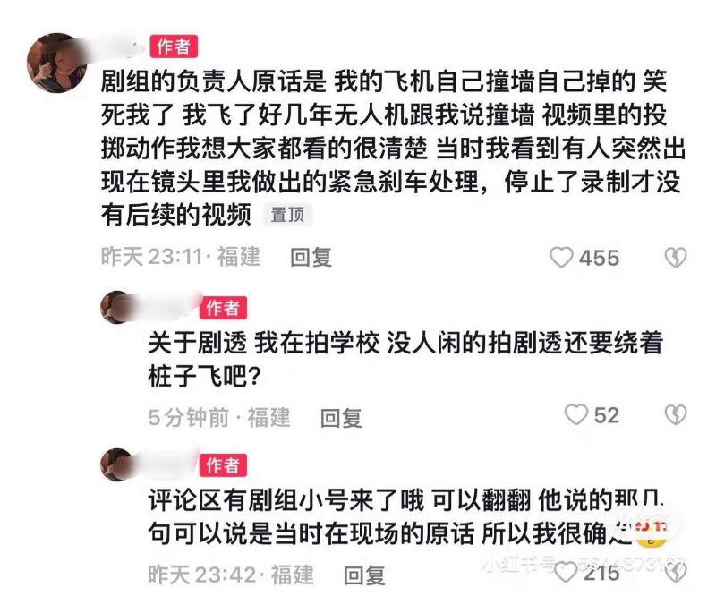 而該網友也在評論區解釋,表示劇組負責人的原話是:「我的飛機自己撞墻自己掉的」,但拍攝的視頻中,的確拍到了有人突然出現在鏡頭里,並做出投擲的動作。另外,該網友針對為什麼要在劇組附近拍攝,表示自己是在拍攝學校👇