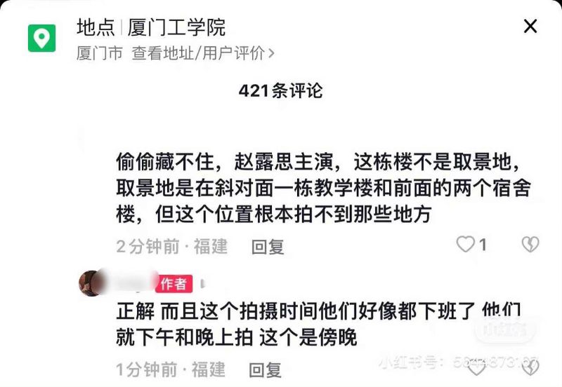 另外,也有同校學生留言,表示這個位置根本拍不到《偷偷藏不住》劇組的拍攝地。樓主也隨之補充自己拍攝時,劇組都下班了。