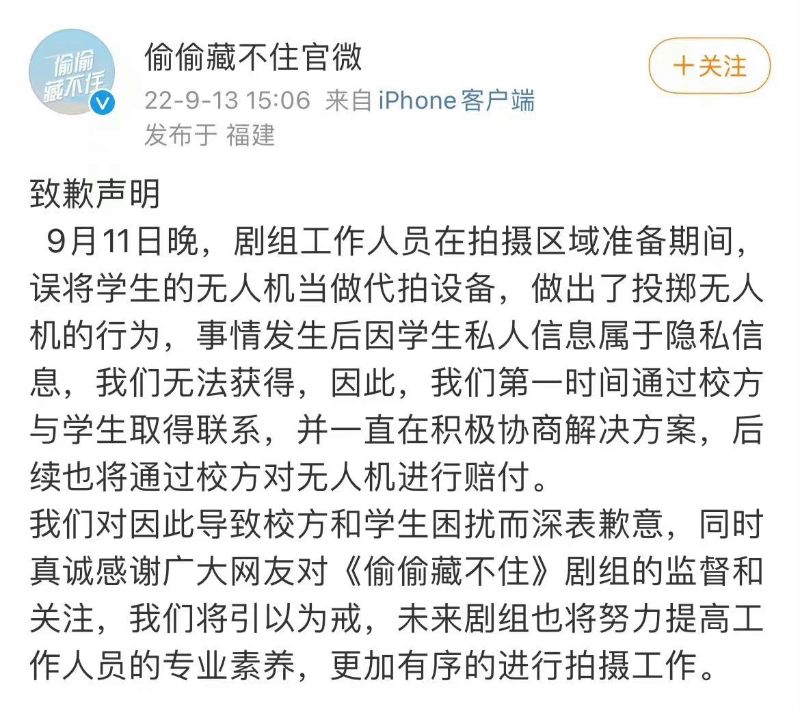 2)事發後因學生私人信息屬于隱私,劇方第一時間通過校方與學生取得聯系,並一直在積極協商解決方案,後續也將通過校方對無人機進行賠付。