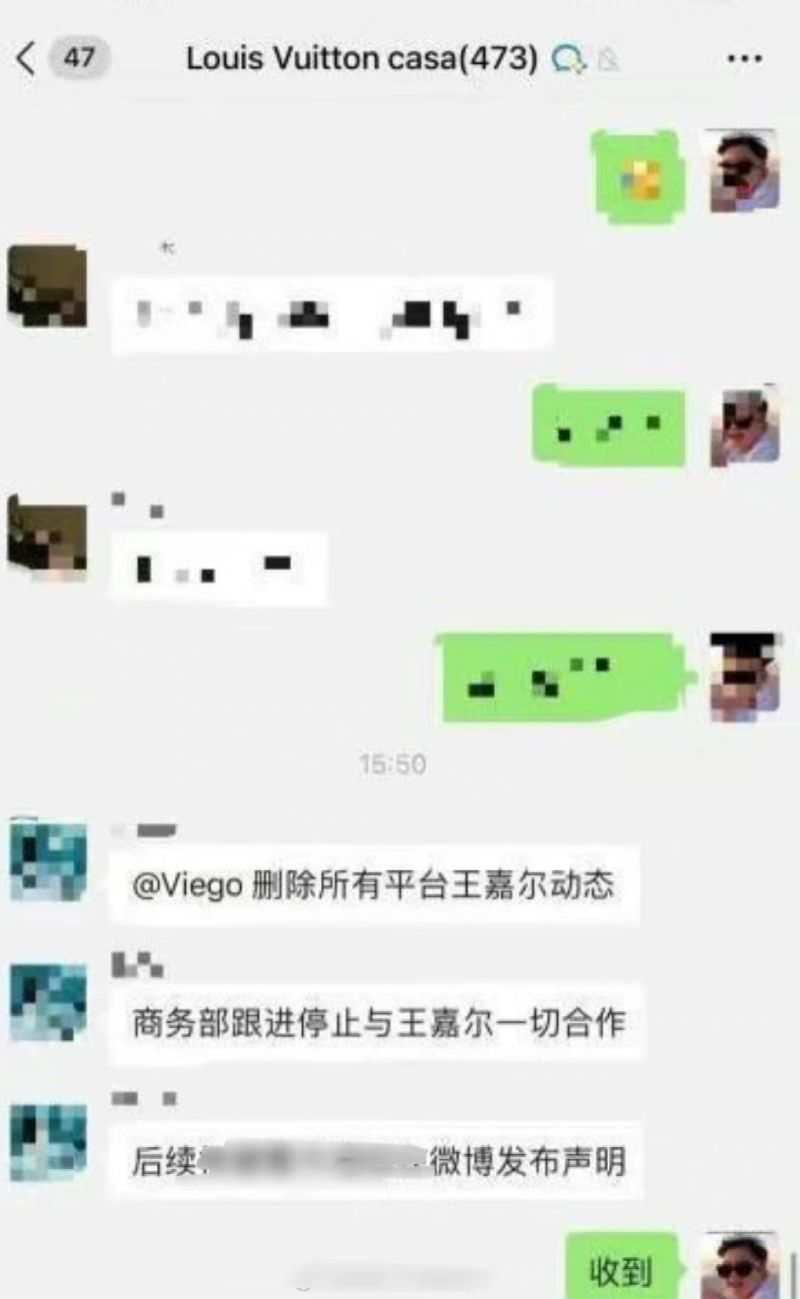 最後,最新的瓜則是有所謂的LV內部人員聊天截圖,表示刪除所有王嘉爾的動態,終止一切合作👇