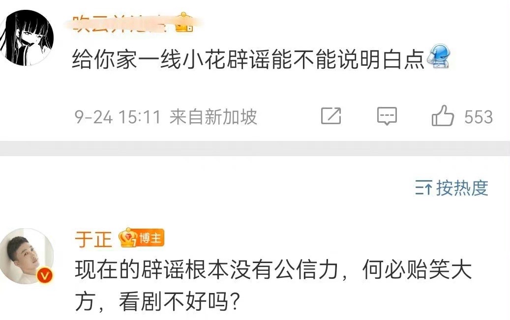 對於粉絲要求明確闢謠,于正表示現在澄清根本沒有公信力👇🏻
