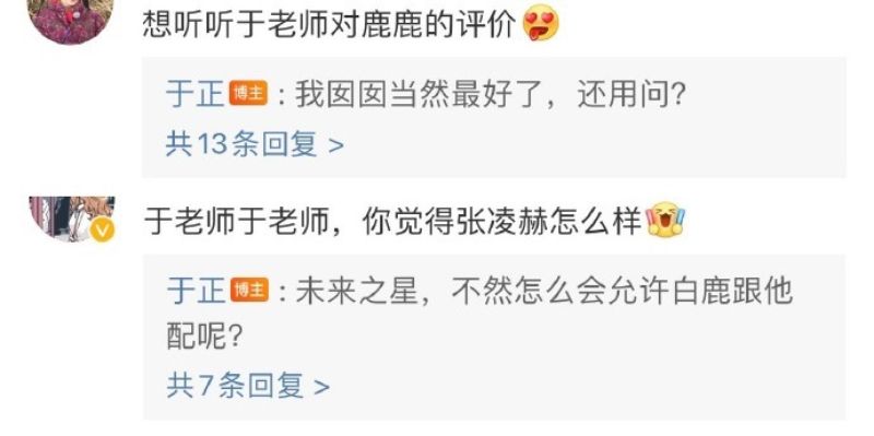 曾有網友問白鹿老闆于正,有關張凌赫的評價,得到的回應是:「未來之星,不然怎麼會允許白鹿跟他配呢?」