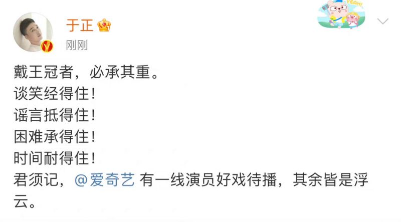 隨後,于正公開了一段話,表示「戴王冠者,必承其重。」並表示有好戲待播,其餘皆是浮雲。