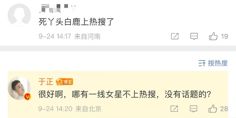 到底這段緋聞是真的嗎?這就來看看白鹿老闆,也就是于正的回復!有網友在他評論區留言:「死丫頭(于正暱稱)白鹿上熱搜了!」但于正的回應很出乎意料,表示:「很好啊,哪有一線女星不上熱搜,沒有話題的?」