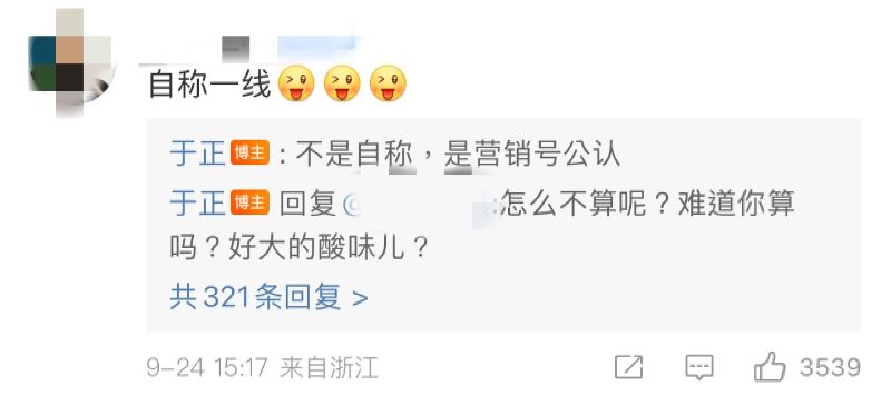 對於緋聞不正面回應,但于正的關注點,顯然只注重在狗仔稱白鹿為“一線小花”,在評論區唯一回復的,就是網友「自稱一線」的留言,反懟表示是營銷號公認👇