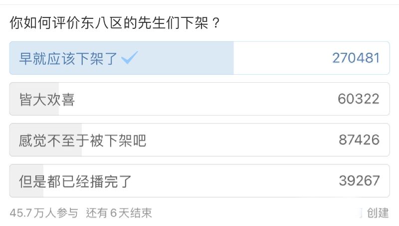 最後,對於如何評價東八區下架,超過45萬網友投票,當中27萬表示「早就該下架了」!6萬表示「皆大歡喜」!但也有近9萬參與投票的網友認為:「不至於被下架吧!」