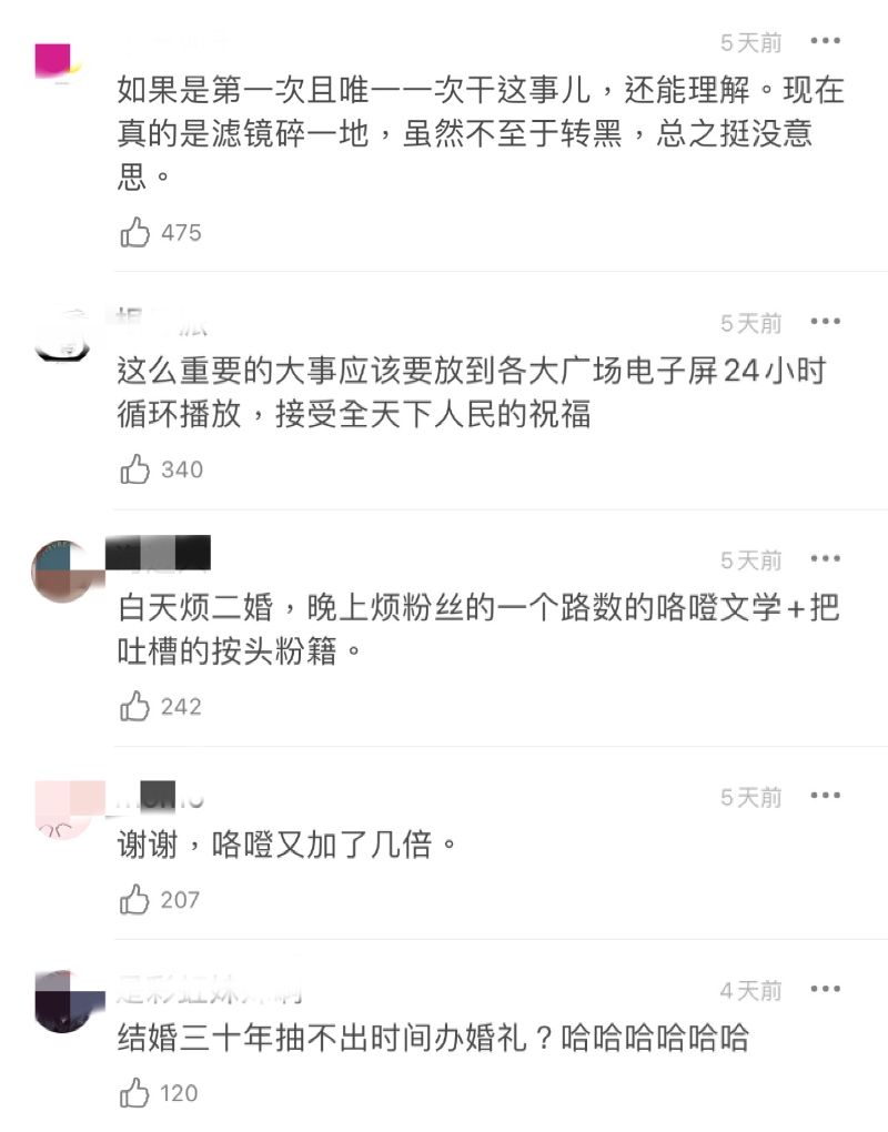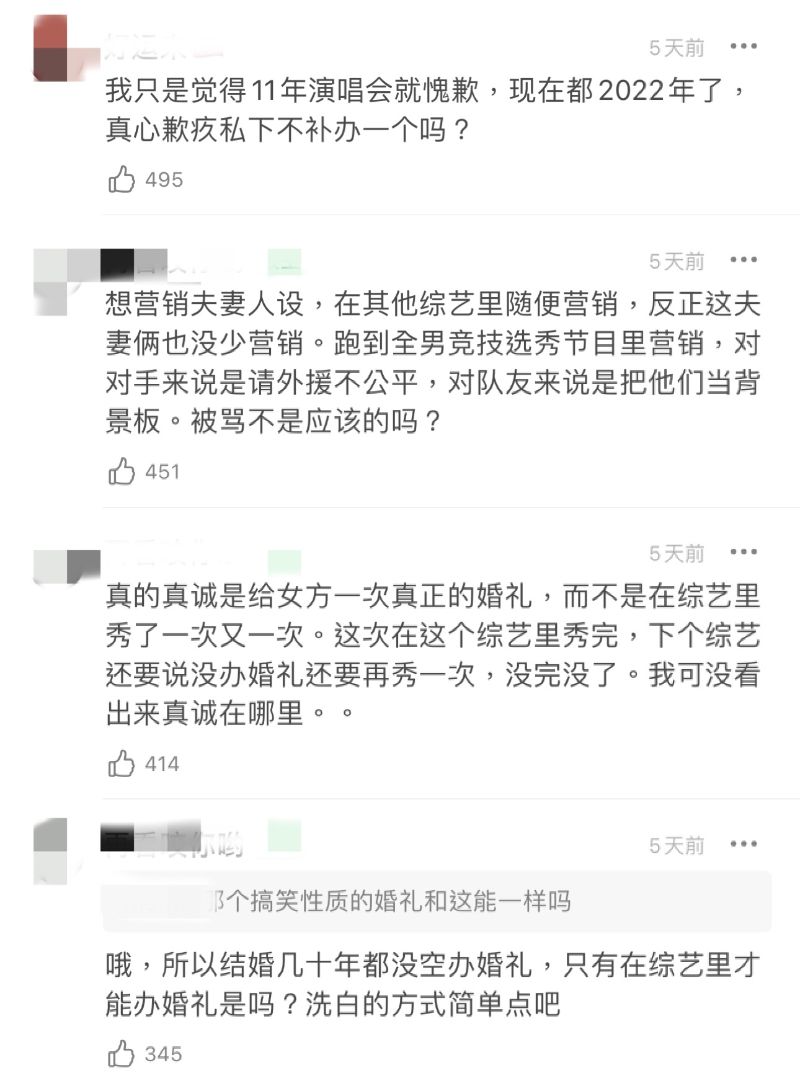不少網友都說被張智霖和袁詠儀的愛情感動了,但也有不少網友認為張智霖勝之不武,在競技舞台打感情牌,甚至質疑起其對靚靚的愛情,表示已經在綜藝中看過張智霖“辦過很多次婚禮”了👇