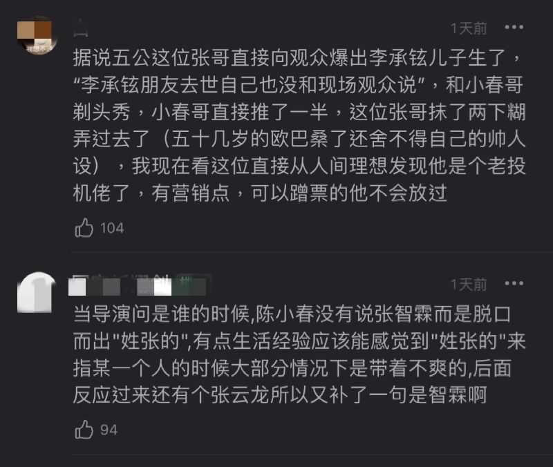 輿論再爭議下去,目前發展到連陳小春在一公時說的話,也再次被網友「解讀」!在一公舞台,陳小春部落表演《風的季節》時,張智霖安排了應采兒“聲音演繹”包租婆的聲音。當時陳小春毫不知情,後來知道了真相,直接喊話Chilam:「怎麽不喊你老婆錄」。
