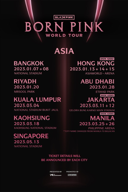 BLACKPINK世巡亞洲場詳情公開!9個國家14場次日期都來啦! 星聞 By 歐巴是我的 Last updated Oct 28, 2022 Share 終於公開更多詳情啦!是達,目前正在世巡的BLACKPINK BORN PINK世巡,終於公開了亞洲場的詳情👇🏻 最新公開的亞洲場,一共有9個國家14場場次,當中香港就有3場,而菲律賓和印尼分別有兩場!馬來西亞的場次則落在3月4日! 在首爾開始巡演之後,BLACKPINK目前正在美國進行巡演中,這次場次公開之後,亞洲區的粉絲終於有機會參與啦! Share