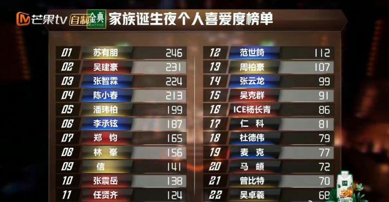 沒錯,從個人喜愛度榜單來看,排名最高的就是蘇有朋的246票,而排名最後的則是吳卓羲(68)、曾比特(70)、馬頔(72)、麥克(77)和杜德偉(79)👇