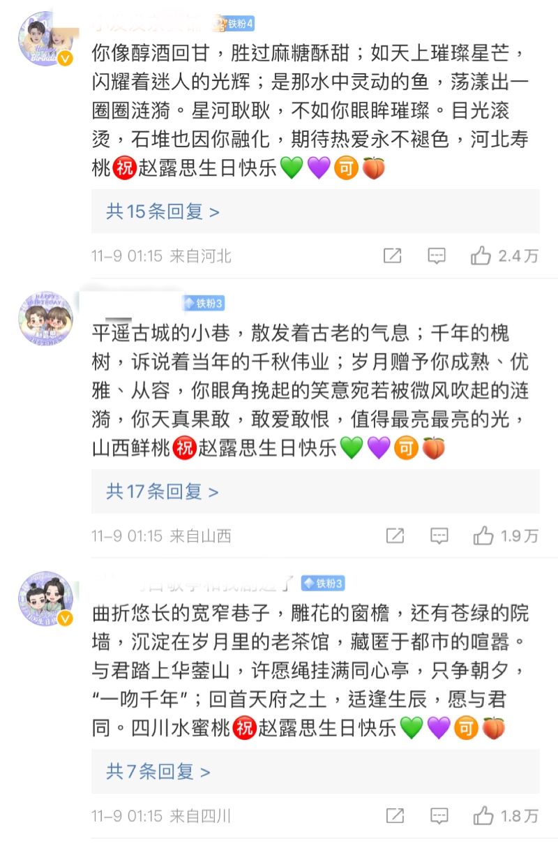 表示CP粉的戰鬥力真的很強,在剛過去的趙露思生日微博下,前二十的熱評,都被CP粉控得牢牢的,清一色青紫💚 💜愛心,分別代表了吳磊和趙露思,拼成了兩人的CP名稱「💚💜🉑️🍑」👇
