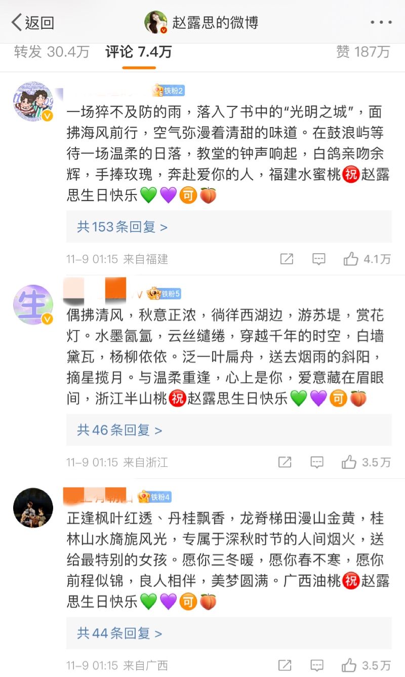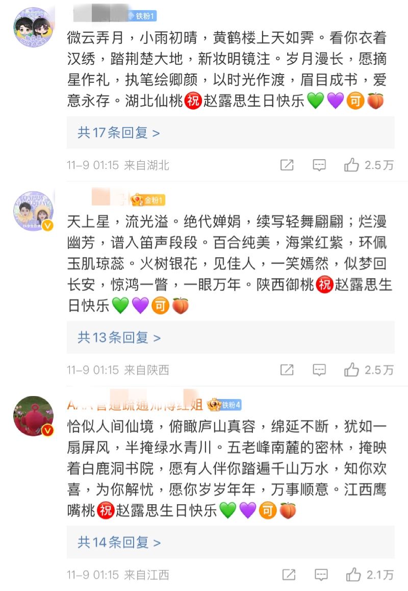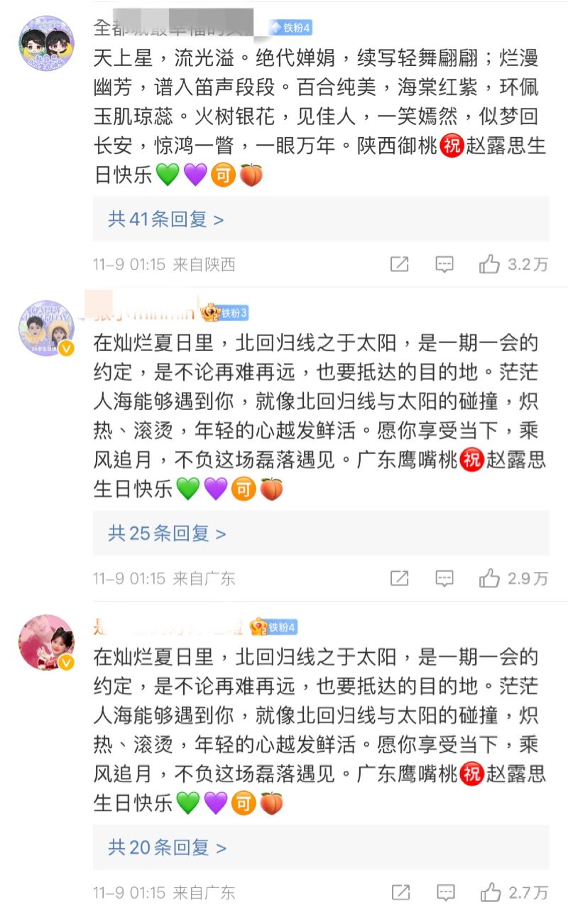 表示CP粉的戰鬥力真的很強,在剛過去的趙露思生日微博下,前二十的熱評,都被CP粉控得牢牢的,清一色青紫💚 💜愛心,分別代表了吳磊和趙露思,拼成了兩人的CP名稱「💚💜🉑️🍑」👇
