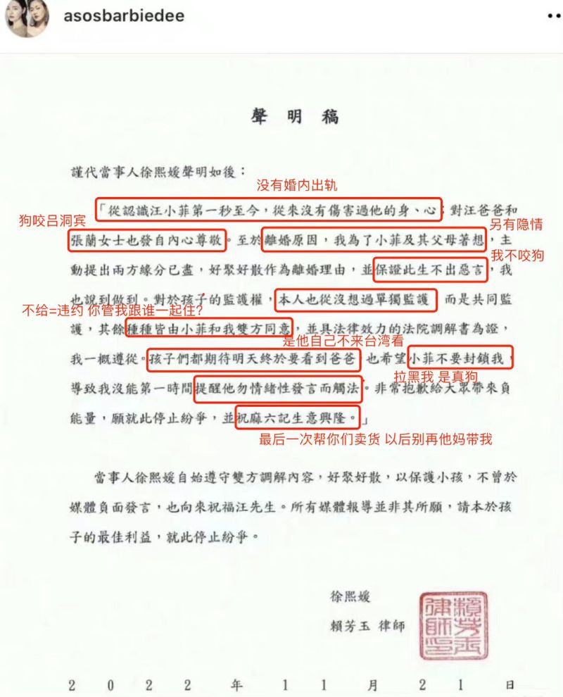 「從認識汪小菲第一秒至今,從來沒有傷害過他的身、心;對汪爸爸和張蘭女士也發自內心尊敬。至于離婚原因,我為了小菲及其父母著想,主動提出兩方緣分已盡,好聚好散作為離婚理由,並保證此生不出惡言,我也說到做到。對于孩子的監護權,本人也沒想過單獨監護,而是共同監護,其余種種皆由小菲和我雙方同意,並具法律效力的法院調解書為證,我一概遵從。孩子們都期待明天終于要看到爸爸,也希望小菲不要封鎖我,導致我沒能第一時間提醒他勿情緒性發言而觸法。非常抱歉給大衆帶來負能量,願就此停止紛爭,並祝麻六記生意興隆。」
