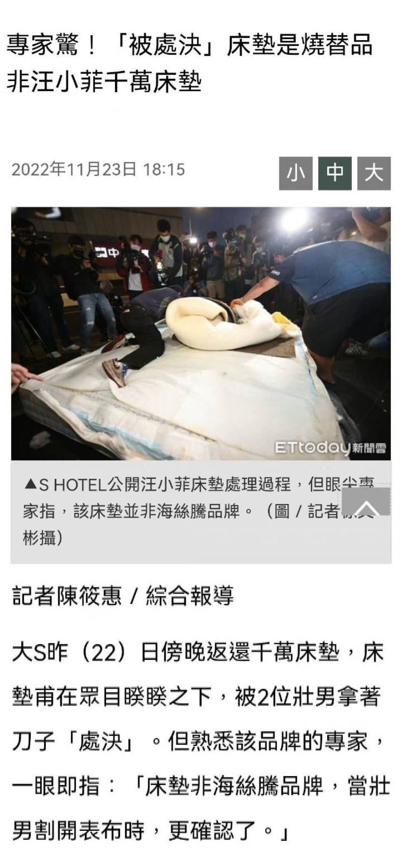 但沒多久,台媒就報導表示「被處決」的床墊是替代品,並非汪小菲的那張海絲騰👇