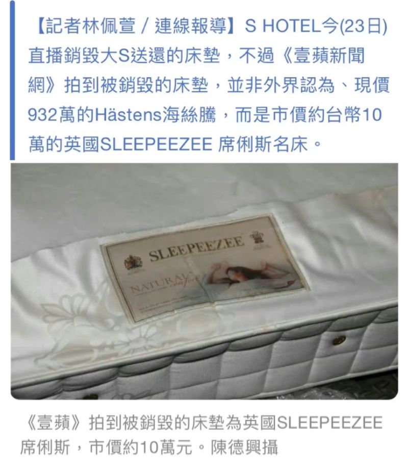 另外,另一家台媒也表示拍到被銷毀的床墊,的確不是海絲騰,而是英國SLEEPEEZEE床墊👇