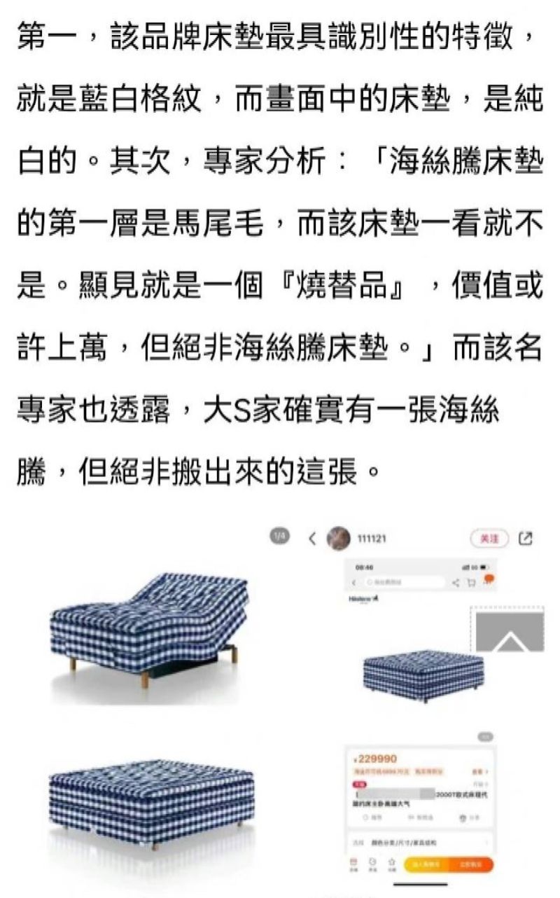 根據台媒報導,專家確認床墊並非海絲騰,尤其當表布被割開時,就更確認這一點,而該專家也透露,大S家的確有一張海絲騰👇