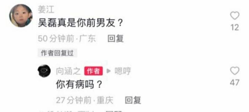 而當網友向向涵之求證吳磊是不是她前男友時,向涵之給出的答復是罵網友有病或者叫網友滾,也沒有給出正面回答,讓眾人自行解讀👇