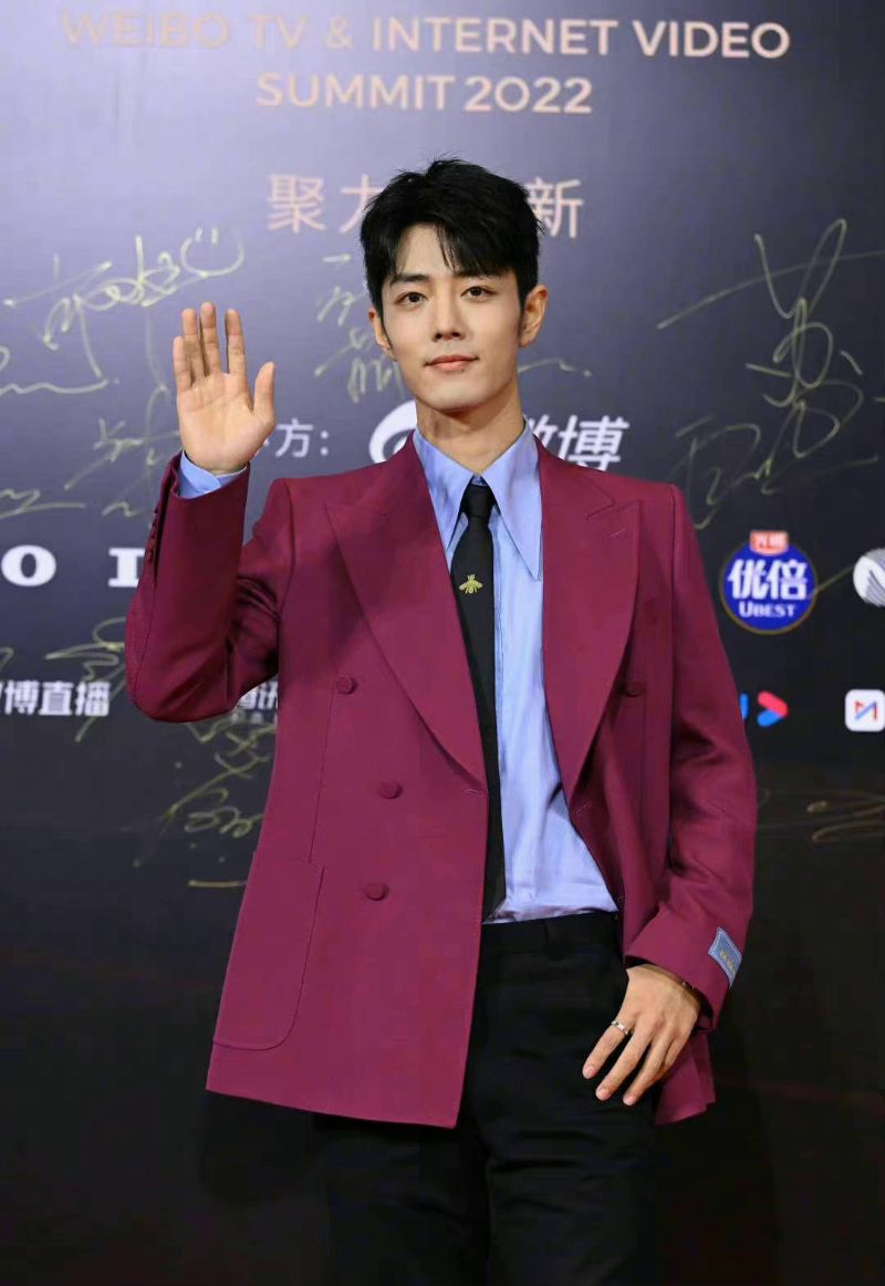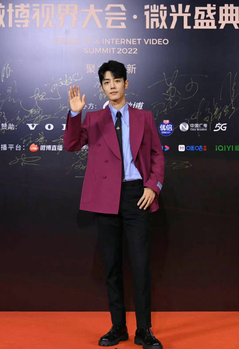 紅毯的壓軸,自然就是許久未走紅毯的肖戰!!!玫紅色西裝配藍襯衫,果然是紳士又溫柔的化身啊!