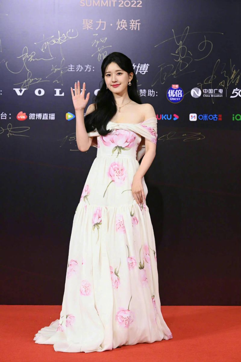 我們的趙露思今晚一字肩花朵裙,笑容依然甜美度滿分!