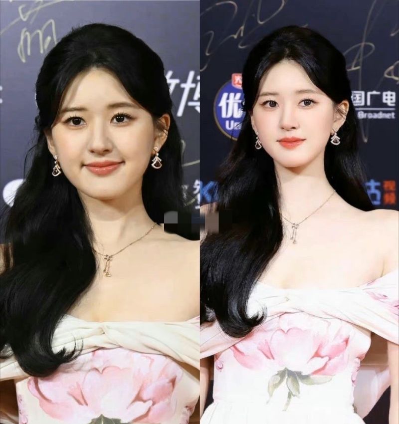 這就先來看看,第一套紅毯造型,趙露思穿了印花長裙,看起來十分青春亮麗,但如果把生圖和精修圖對比,就看見了這樣的分別👇