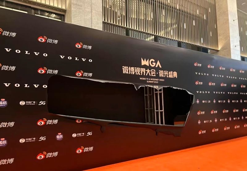這不,典禮還在內場進行,外場的簽名佈景板就被割下來了!