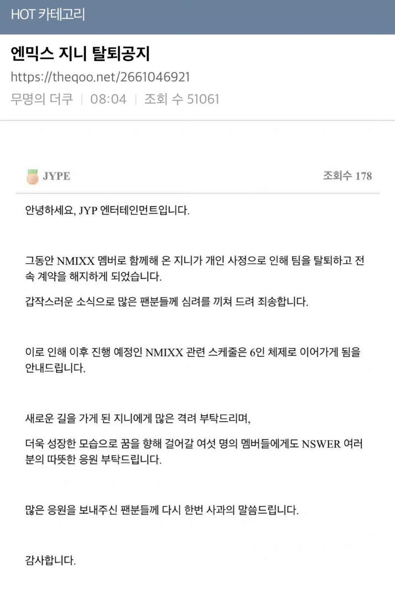 請多多鼓勵JINNI踏上了新道路,希望以更加成長的姿態走向夢想的6名成員們,也能得到NSWER的熱烈支持,再次向粉絲們表示歉意,謝謝。」