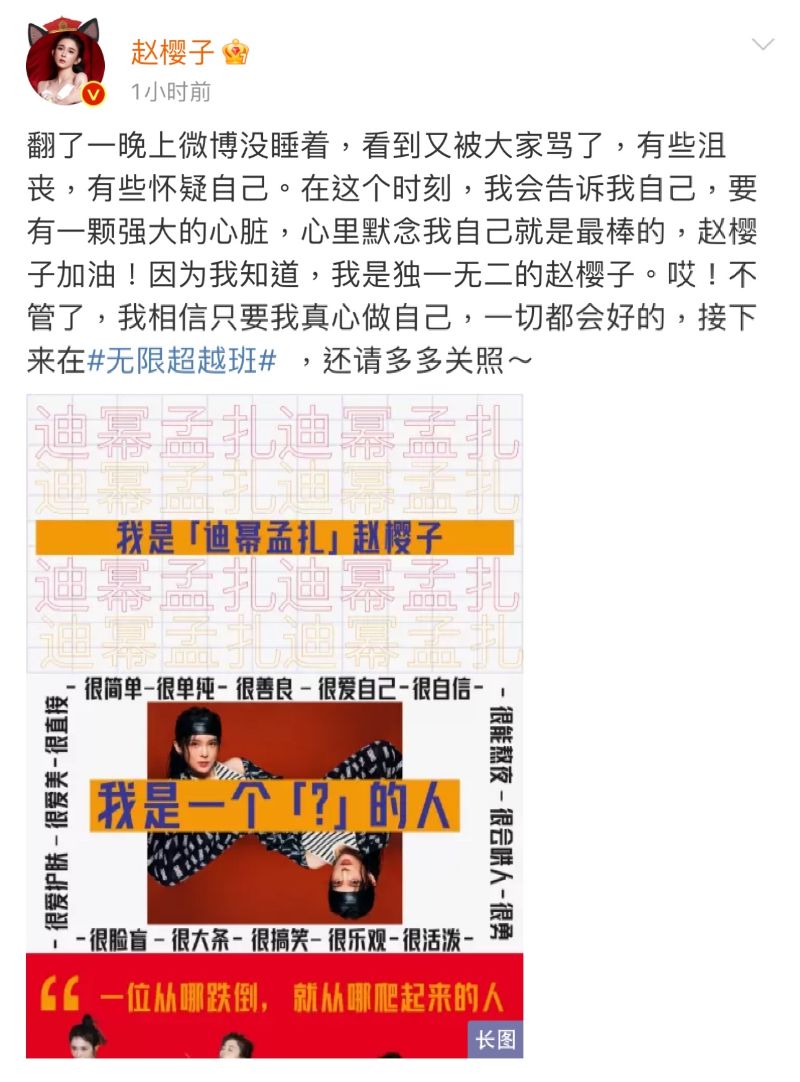 而被罵了一個晚上,18號中午趙櫻子再次發文,表示被罵了一晚上,有些沮喪也有些懷疑自己,但還是相信自己是最棒的!