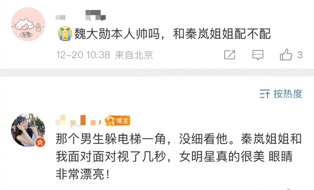 但當其他人詢問有關魏大勳時,該網友僅表示「那個男生躲電梯一角,沒細看他。」不過對於秦嵐卻讚不絕口,表示和她四目交接,女明星十分漂亮。