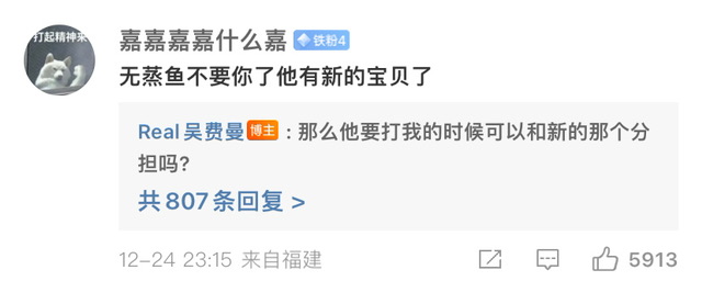 沒想到就有網友去給費曼留言,表示你爸不要你了有新寶貝了! 面對網友的調侃,我們費曼氣定神閒的回复:「那麼他(吳鎮宇)要打我的時候可以和那個新的分擔嗎?」哈哈哈哈哈哈哈哈哈哈哈!