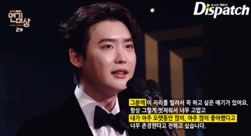 沒錯,李鐘碩在得到MBC演技大賞時的得獎感言引起了關注,他提到了:「退伍之後,有了很多煩惱、不安和躊躇。當時有人給我指引了方向,想借此機會對她說:我一直想對你說我很喜歡你,很尊敬你。看著她,我一直會反思“當時我該更用心努力的,我得成為更好的人”,在過去的日子裏我反省了很多。今後我會努力成為更好的人,成為更用心的演員。」