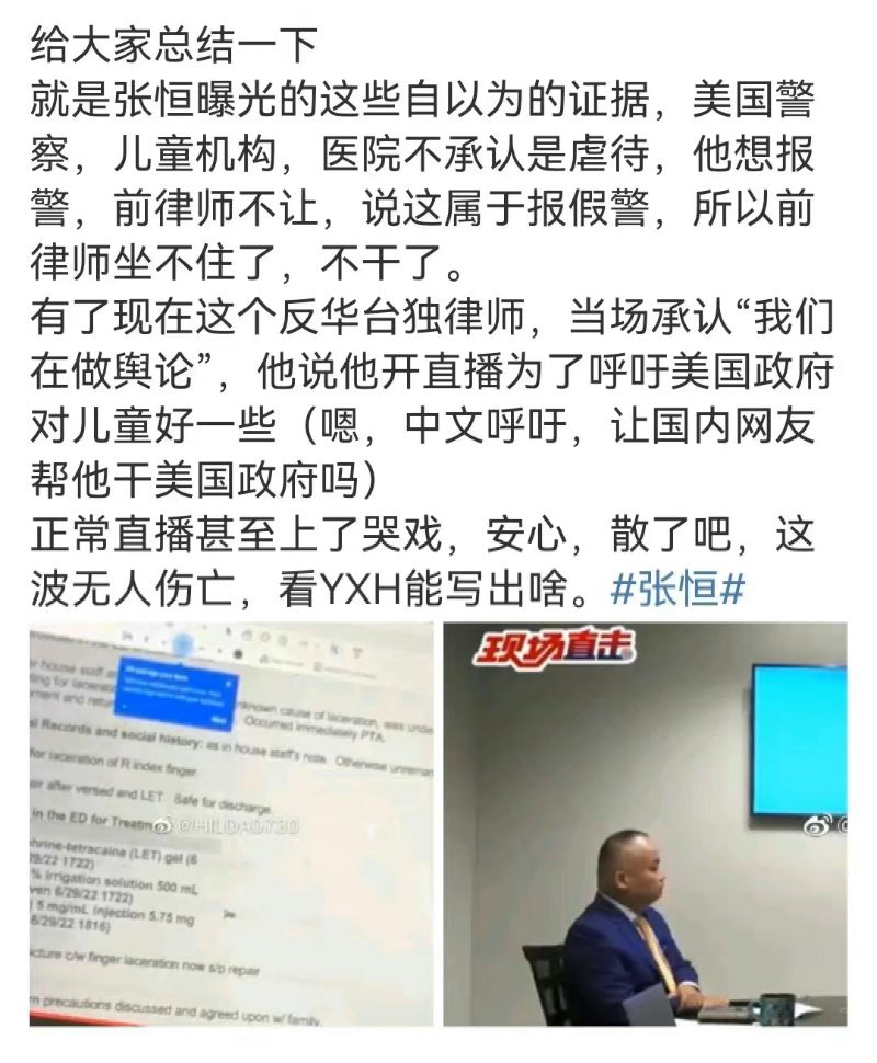 但在微博方面,卻有網友透露表示張恆曝光的這些證據,經由美國警方、兒童機構、醫院等都不承認是虐待👇