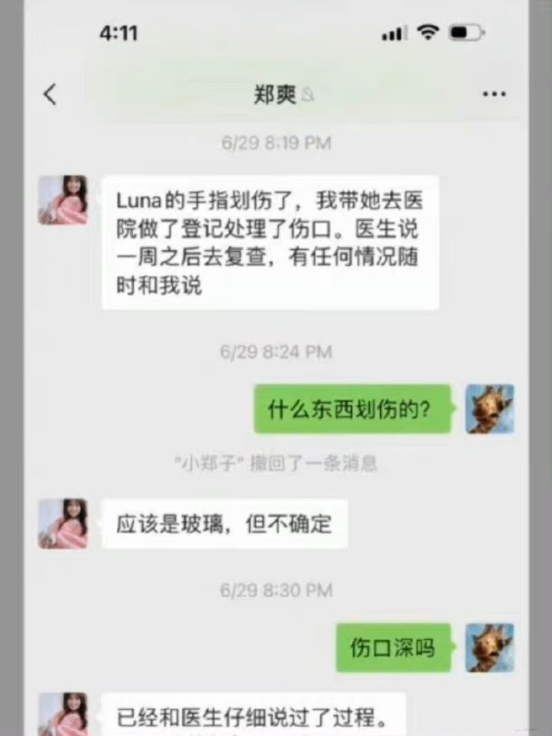張恆也公開了和鄭爽的聊天截圖,他希望鄭爽提供具體的醫療報告,最後他在醫療報告看到,鄭爽對醫生說,她把孩子留給了爸爸,爸爸把孩子留在家裏,然後小孩手指就受傷了。過了幾天她又帶孩子去醫院,這次她和醫生說孩子的手指是被車門夾的。他後來問女兒手是怎麽受傷的,孩子說是剪刀剪的,但沒有透露是誰剪的。